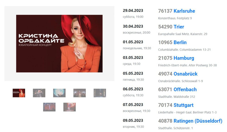 О предстоящих гастролях звезда рассказала в соцсетях и прикрепила ссылку на покупку билетов. Самые дорогие из них на ближайший концерт 29 апреля стоят 129 евро, что в переводе около 11,5 тысяч рублей. Но и бюджетные места люди разбирать пока не торопятся — на сайте полно свободных мест.