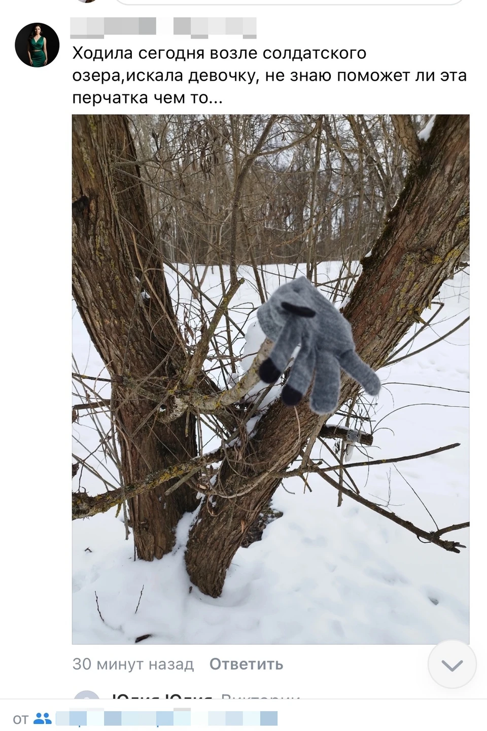 Первая возможная зацепка нашлась возле Солдатского озера, что чуть южнее дома Саши, на дереве висела серая детская перчатка. Но принадлежит ли она школьнице, была ли в тот день девочка в них — точного ответа нет. У самого озера дурная слава, в Смоленске его называют «проклятым», там не раз тонули люди и даже как-то вылавливали убитую женщину.