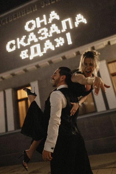 Влюбленные показали эффектный кадр. Над парой сияет светящаяся надпись: «Она сказала да!»