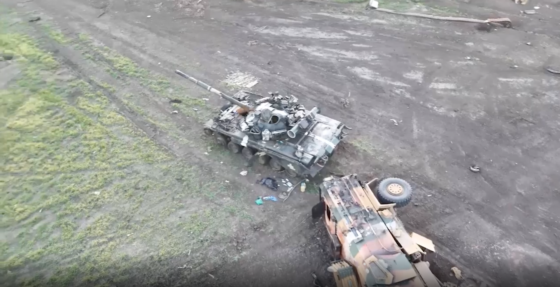 На кадрах с беспилотника показано уничтожение двух единиц украинской бронетехники в поле у лесополосы. Затем демонстрируются танк Т-80БВ и бронеавтомобиль Kirpi турецкого производства.