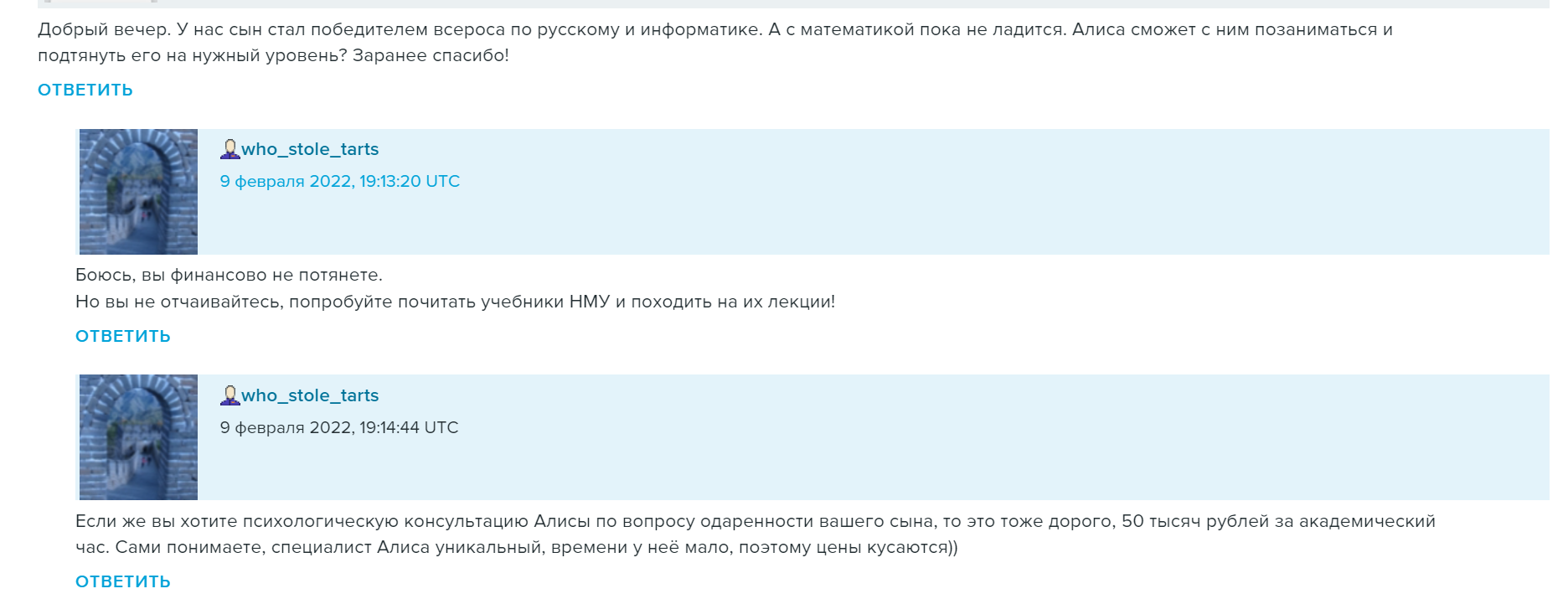 Удовольствие это, конечно, не бесплатное, о чем Евгений без обиняков заявил одной из подписчиц своего Живого журнала. Женщина рассказала, что ее сын стал победителем Всероссийской олимпиады по русскому языку и информатике, но вот с математикой дела обстоят не так хорошо — не сможет ли Алиса позаниматься с мальчиком?
