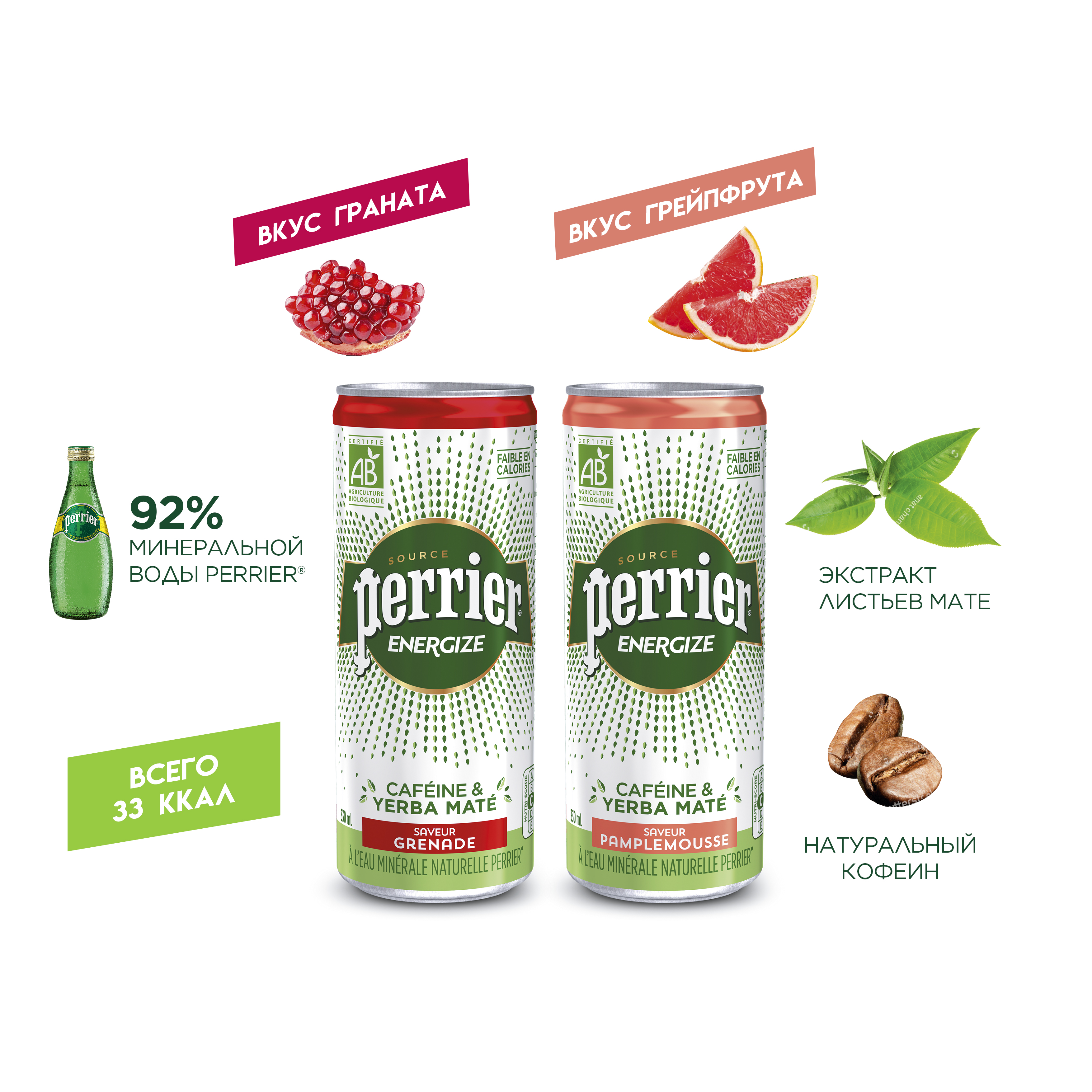 С новинкой от Perrier восполнить силы без отрыва от череды насыщенных событий станет куда проще и приятнее — в основе тонизирующего напитка игристая минеральная вода Perrier, натуральный кофеин и экстракт листьев Мате. На выбор два вкуса: пикантный гранат и свежий грейпфрут.