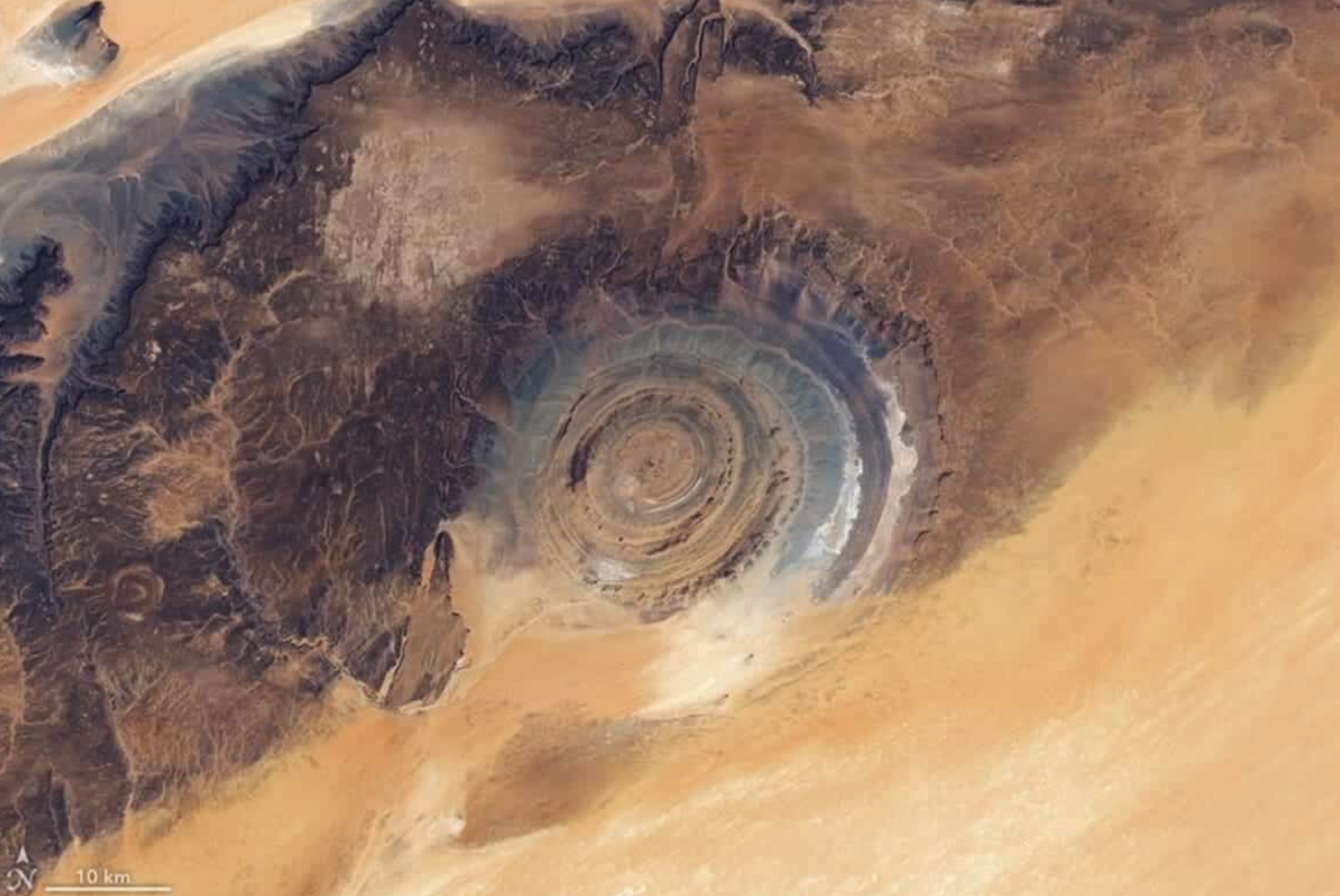 «Глаз Сахары» находится в северной части Мавритании. Это необычное тёмное плато, состоящее из колец. Последние, по мнению учёных, могли появиться тогда, когда в Сахаре ещё были реки. Появившиеся извилистые углубления — оставшиеся речные русла. Так считали ещё пару десятилетий назад