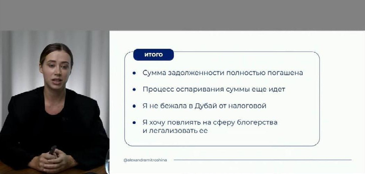 А вот еще одной россиянке и давней жительнице ОАЭ уже бояться нечего. Саша Митрошина погасила почти весь свой долг перед государством. Ранее блогерша, проживающая около года в Дубае, обвинялась в неуплате более сотни млн рублей в казну Российской Федерации. Однако теперь, согласно ее словам, Александра почти полностью урегулировала вопросы с налоговой, оплатив 111 млн рублей, и признала свою вину.