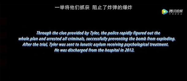 "Полиция раскрывает план благодаря подсказке, сделанной Тайлером, арестовывает всех преступников и предотвращает взрыв бомбы. После суда Тайлер отправляется в психиатрическую больницу на лечение. Из больницы он выходит в 2012 году", – гласит текст на экране.