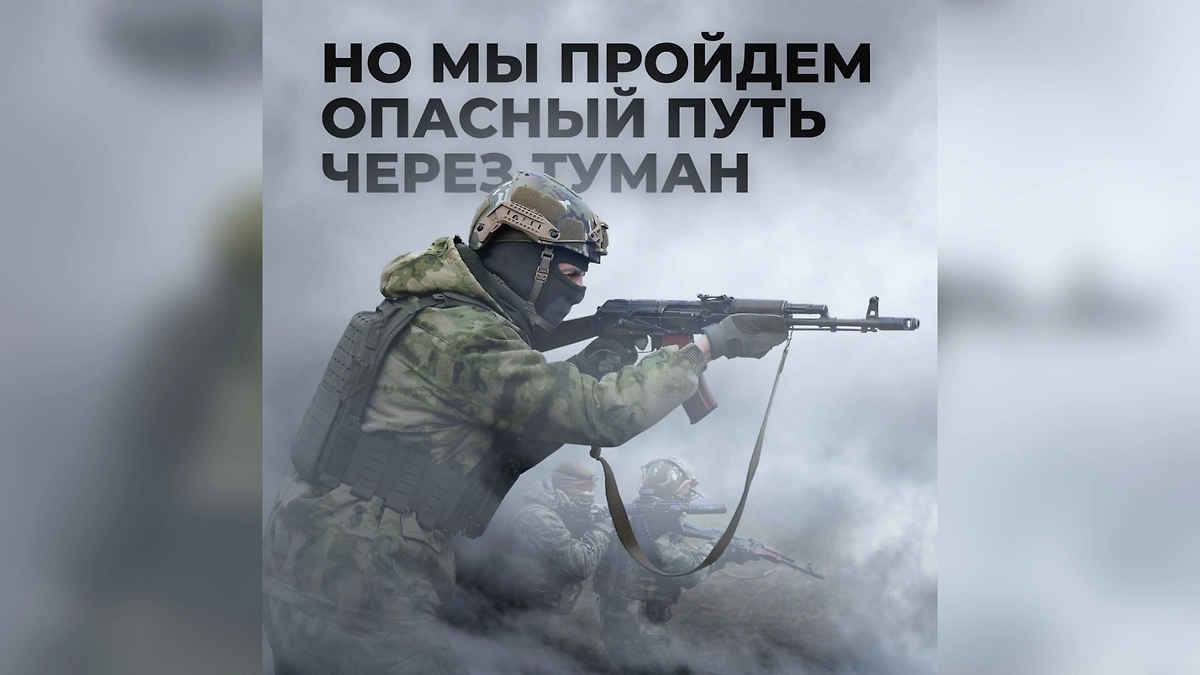 «Но мы пройдём опасный путь через туман», — на изображении, на котором российские бойцы с оружием наизготовку двигаются сквозь плотную пелену.
