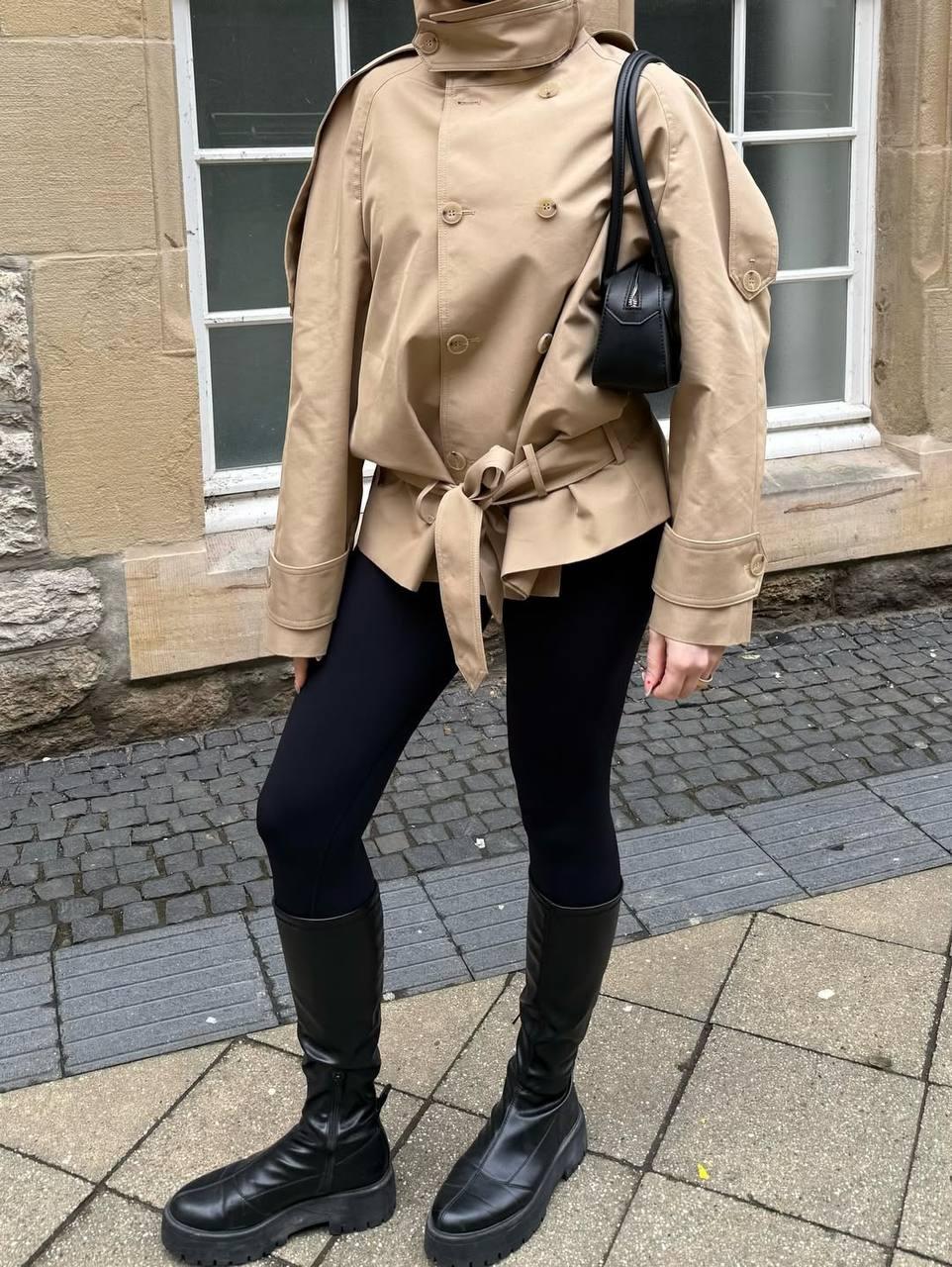 Носить такие тренчи предлагают с чем угодно. Сложности могут возникнуть разве что с укороченными моделями, где пояс уже вшит именно на уровне бедер и сместить его не получится. Такие варианты действительно притягивают все внимание к себе. Поэтому стилисты советуют не спорить с тренчем, а просто стилизовать его с максимально простым низом, вроде черных лосин, классических брюк и прямых джинсов. Хотя многие модницы носят их поверх капри, макси-платьев и даже поверх спортивных костюмов. Этот контраст между четкой структурой плаща и расслабленностью смотрится особенно эффектно. А в качестве акцентов можно добавить крупные очки и головные уборы, но тут главное не переборщить. Ведь этот тренч сам по себе достаточно выразительный.