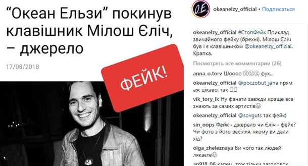 В украинской группе Океан Эльзы заявили, что информация об уходе клавишника Милоша Елича не соответствует действительности. Об этом говорится опровержении, размещенном в официальном instagram группы.
