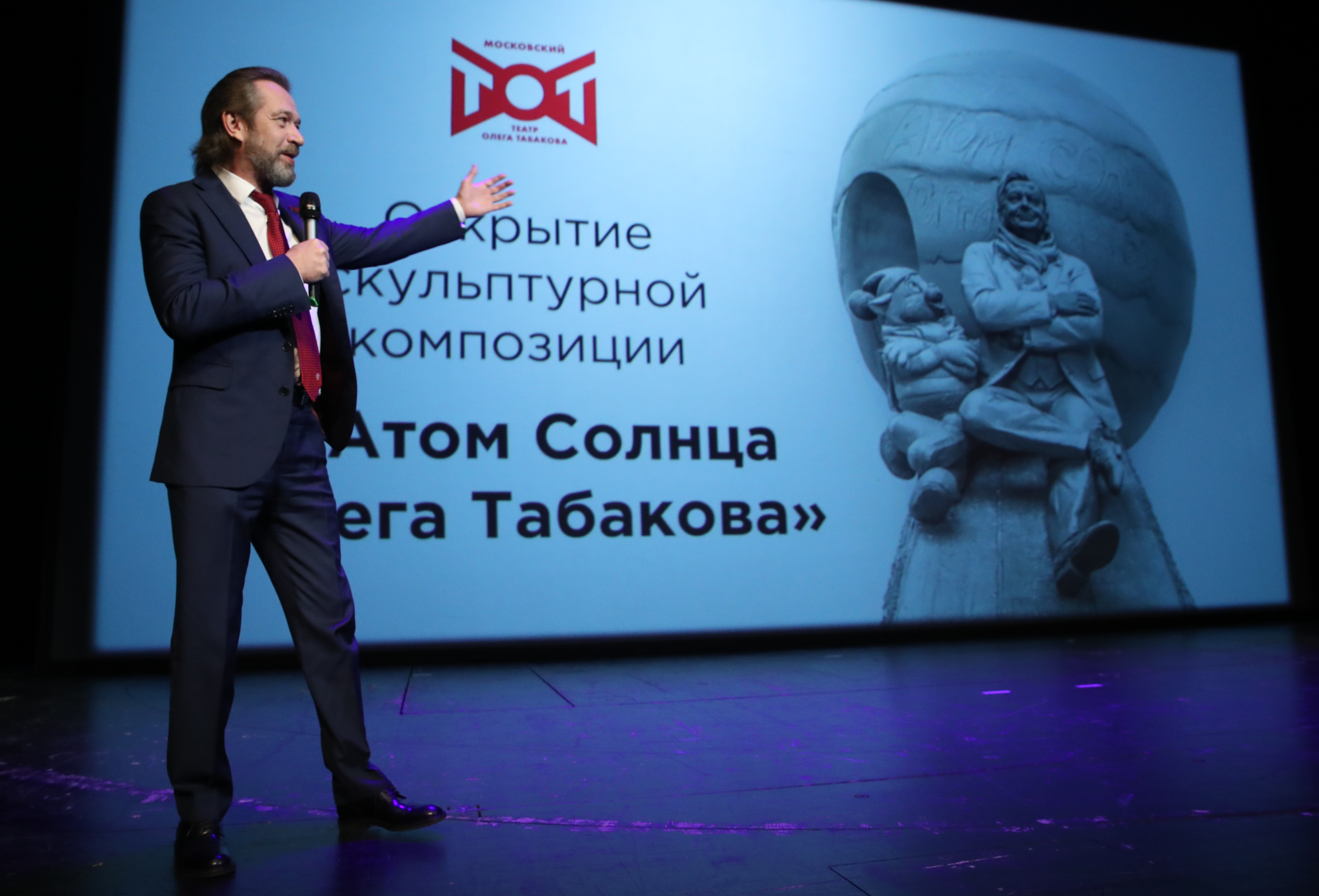 Если быть точнее, то это целая скульптурная композиция: Олег Табаков и кот Матроскин сидят на подмостках, прислонившись к сфере — «Атому Солнца».