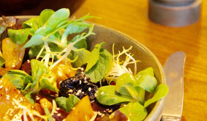 - На блюдо выложить ломтики свеклы и ананаса сверху чернослив, ядро грецкого ореха. Украсить листьями микст-салата, полить медово-имбирной заправкой и посыпать семенами кунжута.