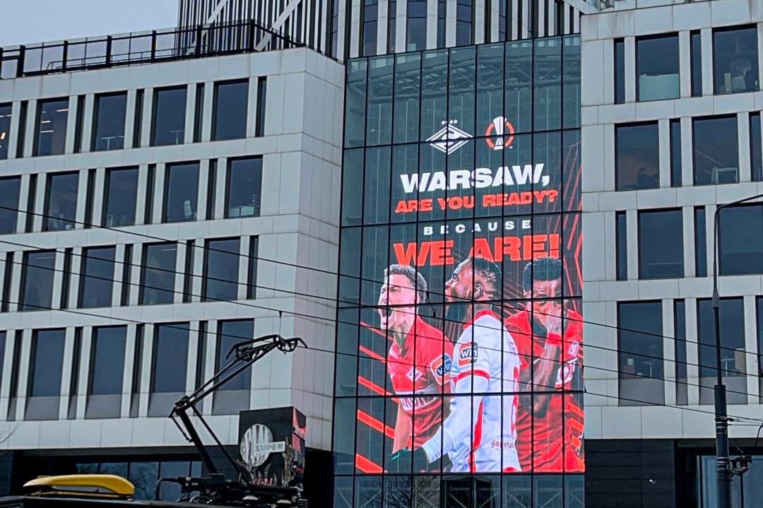 Московский "Спартак" перед матчем Лиги Европы с "Легией" арендовал рекламный экран, на котором разместил плакаты в свою поддержку на одном из зданий в Варшаве. Об этом сообщает пресс-служба красно-белых в собственных соцсетях.