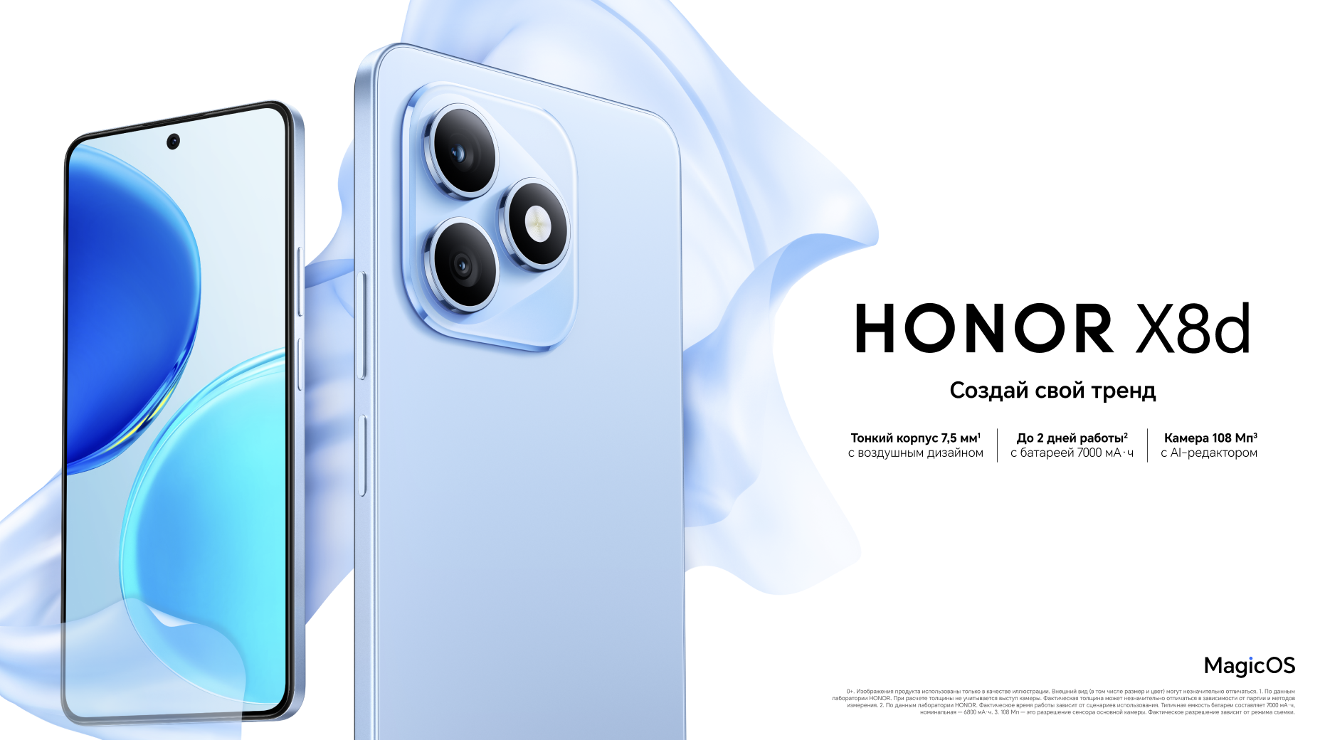 HONOR X8d уже доступен в Воздушном голубом, Вельветовом черном и Вельветовом сером. До 16 февраля его можно приобрести со скидкой и получить в подарок наушники или умные часы.