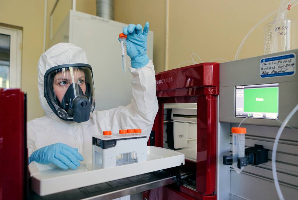 В лаборатории Национального исследовательского центра эпидемиологии и микробиологии имени академика Н.Ф. Гамалеи Минздрава России. Фото © ТАСС / РФПИ и центр имени Гамалеи