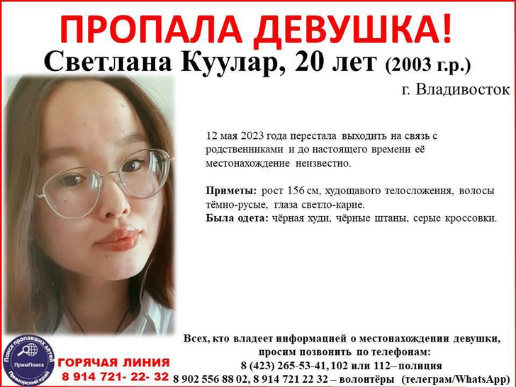 Студенку ДВФУ Светлану Куулар, которая пропала во Владивостоке 12 мая, нашли. Увы, мертвой. Девушка утонула, но не исключено, что ее опасения были небеспочвенны и кто-то совершил убийство. Так или иначе — в трагедии теперь разбираются следователи, по факту случившегося возбуждено уголовное дело по статье «Убийство».