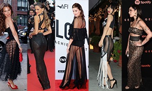 Еще в начале года большинство звездных красоток носили полностью или хотя бы прозрачный верх, под который надевать бюстгальтер считалось даже наприличным. Сейчас мода резко сделала поворот на 180 градусов. Теперь в фокусе платья с прозрачными юбками, которые почти полностью обнажают ягодицы, оставляя для фантазии лишь самую малость.