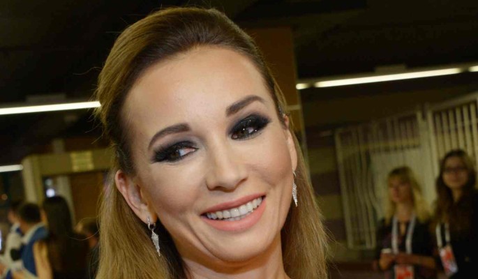 В кадре знаменитость позирует на фоне фонтана на ВДНХ. Телеведущая запечатлена в тельняшке с глубоким декольте, серых брюках и голубом берете. В руках она держит флаг ВДВ.