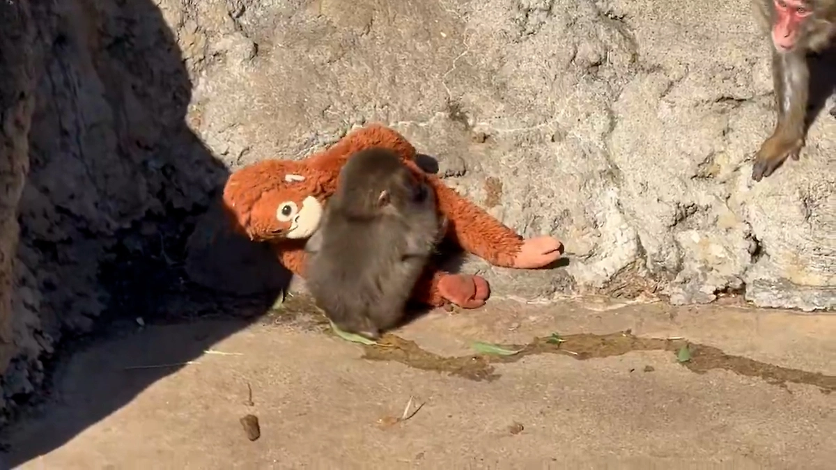 Макака схватила Панча и начала таскать по земле. Малыш сумел вырваться и сразу же побежал к своему единственному утешению – плюшевому орангутану, которого сотрудники зоопарка дали ему вместо матери. Обняв игрушку, Панч смог немного успокоиться.