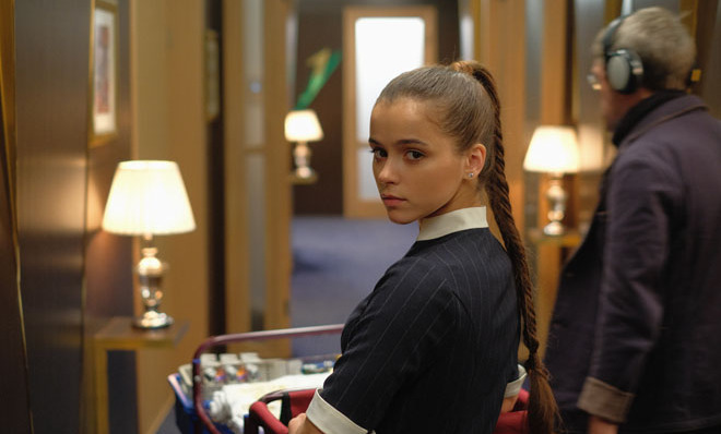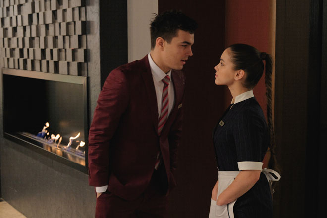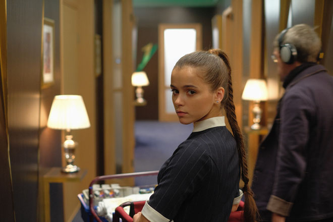 Героиня Милы Сивацкой, кажется, неплохо это понимает. Устроившись на работу в отель, она не только не эпатирует окружающих, но даже дресс-код не нарушает. Подходя, впрочем, к ограничениям творчески. Ее прически, например, это демонстрация последних парикмахерских трендов: идеальную косу «рыбий хвост» можно как следует разглядеть на экране своего мобильного кинотеатра .