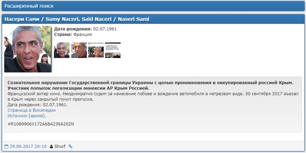 "Сознательное нарушение государственной границы Украины с целью проникновения в оккупированный Россией Крым. Участник попыток легализации аннексии АР Крым Россией. (…) 30 сентября 2017 въехал в Крым через закрытый пункт пропуска", – говорится в профиле Насери на сайте Миротворца.